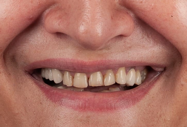 We restored the vertical occlusal dimension by rehabilitating the lateral areas with implant-supported restorations, while the frontal area was rehabilitated with ceramic veneers.