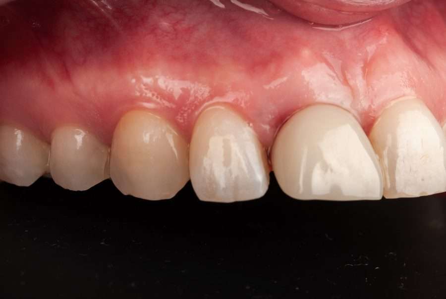 After the incisor extraction and bone reconstruction with the associated healing and provisional period, we guidedly inserted a premium implant, with immediate application of a provisional restoration.